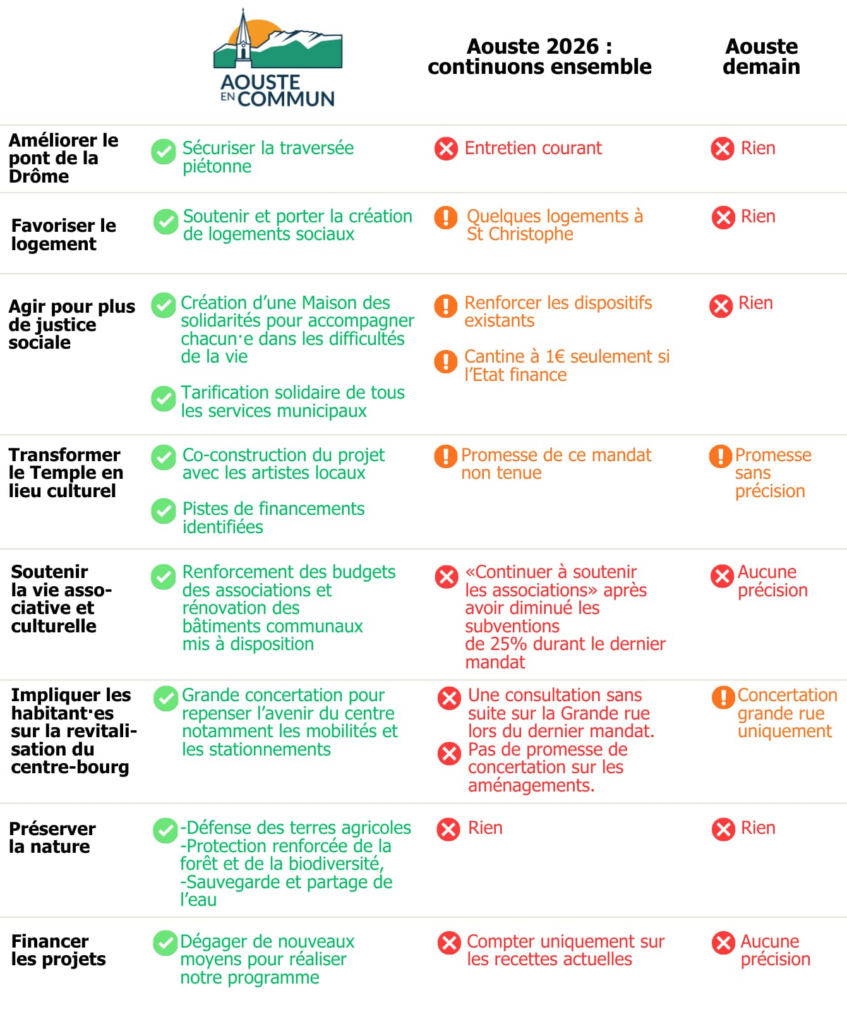 Un grand merci aux Aoustois et Aoustoises qui nous ont fait confiance et qui se sont reconnus dans « Aouste en commun » et ses propositions ! Ce n’était pas notre choix initial de conduire une liste autonome, mais force était de constater que nous n’avions pas les mêmes approches et visions que la liste Aouste 2026. Nous sommes aujourd’hui fièr.es d’avoir mené une campagne tambour battant qui nous amène à seulement 180 voix d’écart de la liste arrivée en tête. Tout reste à jouer le 22 mars ! Nous nous réjouissons d’avoir permis de faire vivre un moment fort de démocratie au village.
