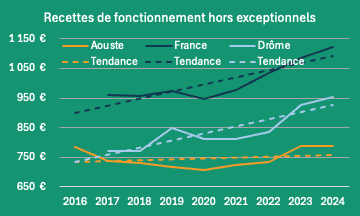 En 2024, la commune de Aouste-sur-Sye disposait de 2,2 millions d’euros de recettes de fonctionnement, soit 807€ par habitant·e. Dans les communes comparables la moyenne est de 1 124€ par habitant·e :